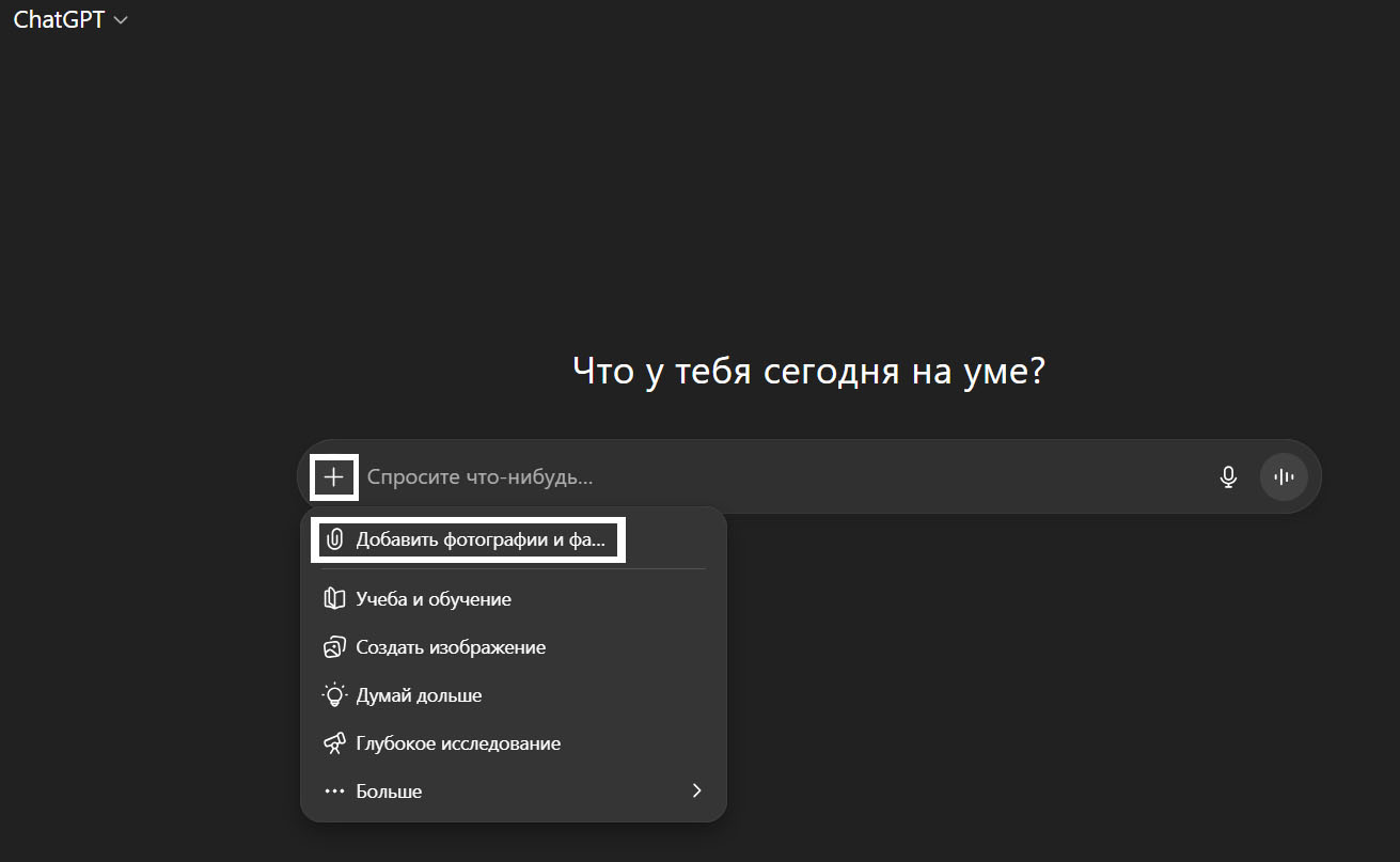 Сначала нажмите на + в поле ввода, а затем на Добавить фотографии и файлы, чтобы прикрепить файлы с устройства.