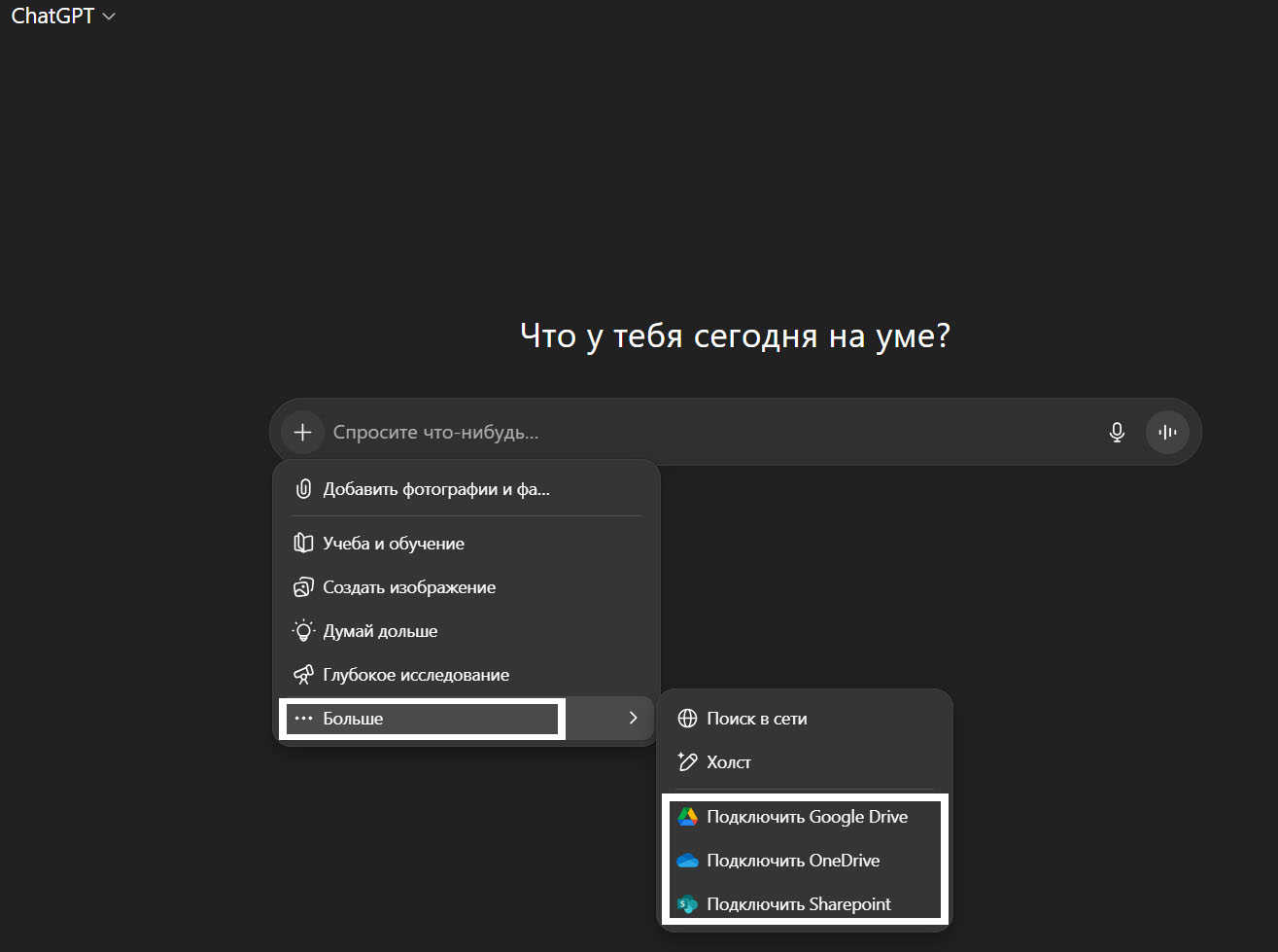 Чтобы добавить файлы из приложений, нажмите на Больше и выберете Подключить Google Drive/OneDrive/Sharepoint.