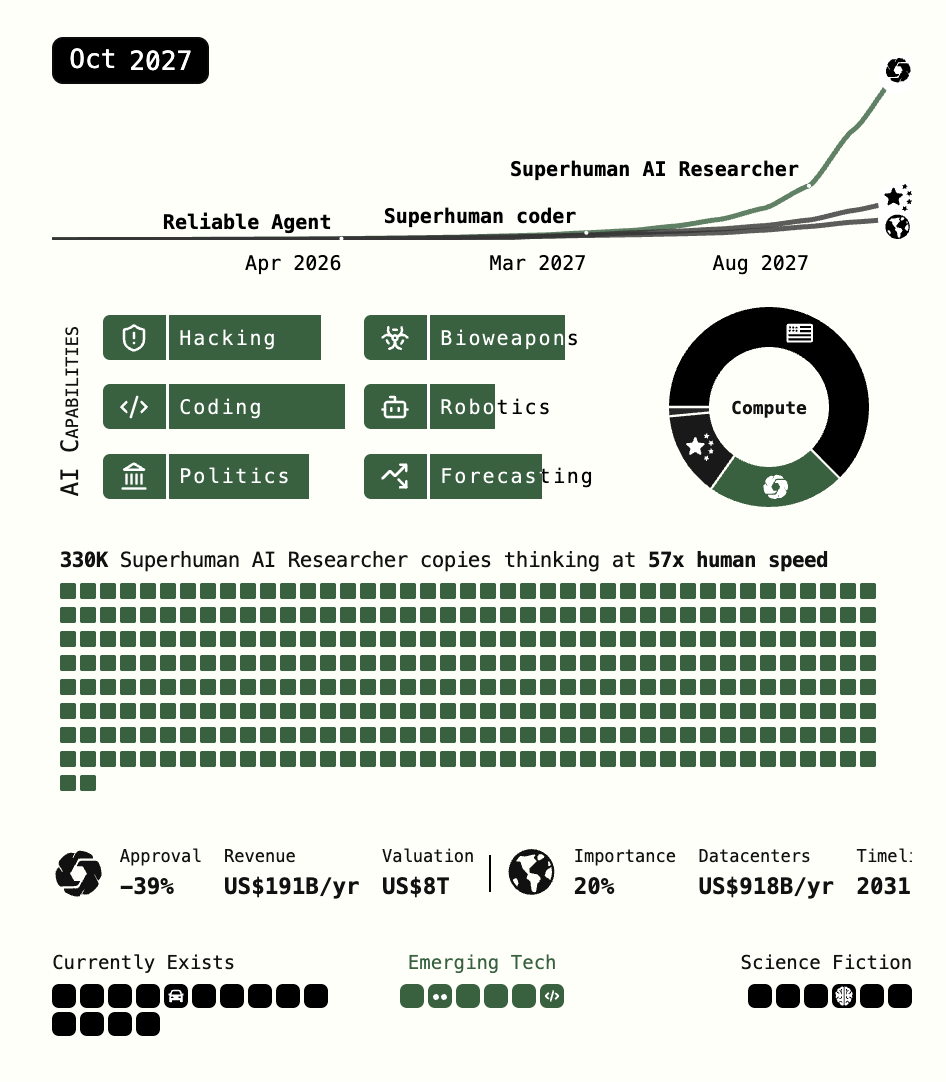 Своего рода апогеем «моральной паники», связанной с неопределенностью технологического будущего, стала нашумевшая статья AI 2027, вышедшая в начале 2025 года. Эта футуристическая статья представляет собой описание очень близкого, рассчитанного буквально по месяцам будущего, в котором искусственный интеллект начинает управлять миром.