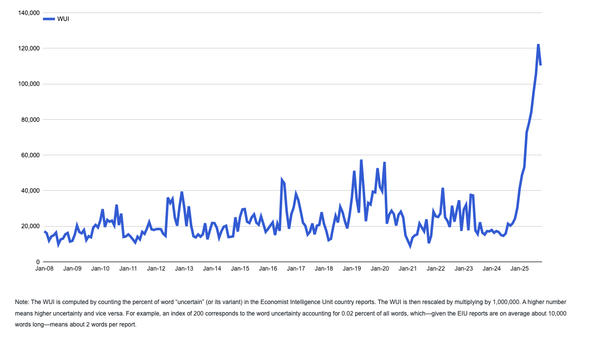 В 2025 году общая рыночная стоимость Семерки превысила две самых больших экономики мира — экономику Китая и Евросоюза. Экономисты говорят об исторически беспрецедентном явлении, но понять, что это значит на самом деле, никто не может. В какой степени судьбы мира определяются теперь коммерческой выгодой нескольких компаний? Наблюдаем ли мы огромный финансовый пузырь, который скоро лопнет? Эти вопросы задаются без всякой надежды на внятные ответы. Лучшим визуальным выражением этого глобального непонимания будущего является резкий взлет графика индекса неопределенности (World Uncertainty Index), который ежеквартально рассчитывается по количеству слов «uncertain» и его вариантов в отчетах группы The Economist о экономике разных стран.